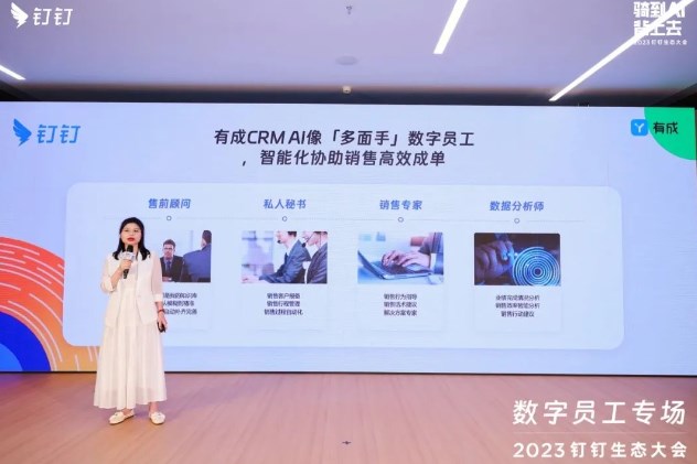 ▲有成CRM“销售专员”数字员工亮相2023钉钉生态大会