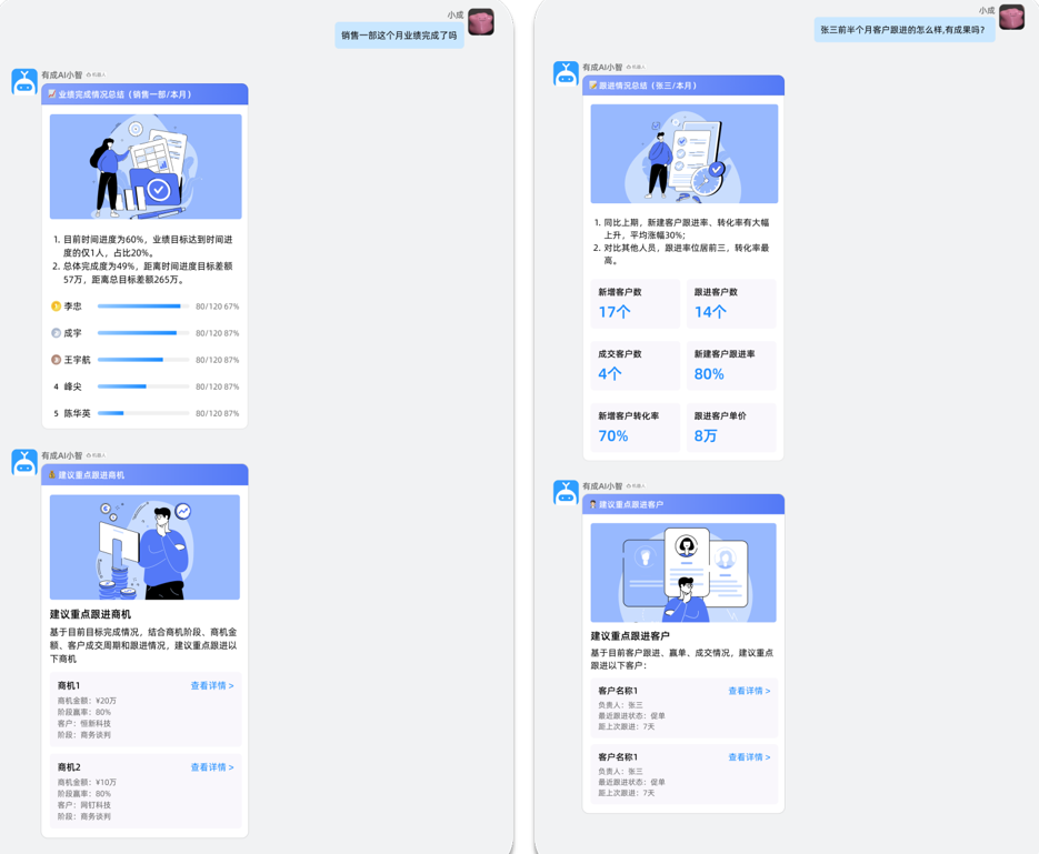 对于管理层而言,最关心的就是企业业绩目标完成情况,但每当管理者要查看业绩报表,需要在各种系统后台操作,进行数据的汇总、整理和分析,甚至需要销售主管、销售助理或财务参与才能完成报表数据。而这时若有了有成CRM“销售专员”数字员工,它就是老板优秀的数据分析师,只要问它:小智,请问销售一部这个月的业绩完成情况怎么样了?小智立马会推送目标完成实时数据统计图表,包括本月业绩总目标,完成度情况,距离目标差距,每个成员的业绩目标完成情况、转化率等;同时,它还会结合目标,商机阶段、金额、客户成交周期和跟进情况,对重点跟进商机进行建议。而这一系列的数据分析,让管理层心中有“数”,有利于企业管理决策和提高管理效率,降低风险和成本,实现业务增长和价值创新。